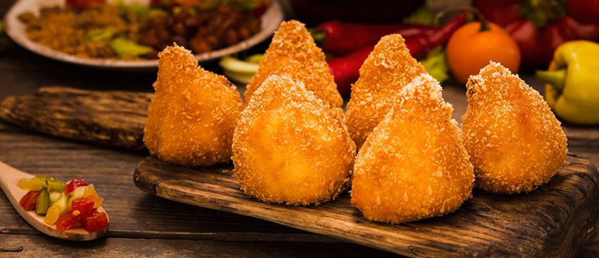 Coxinha de frango com a qualidade da farinha Reisa, crocante por fora, macia por dentro e pronta para girar no balcão.